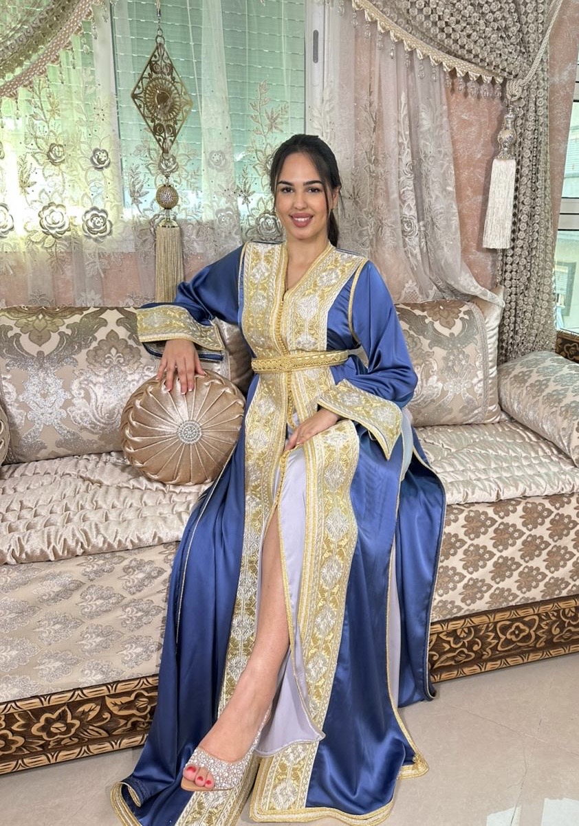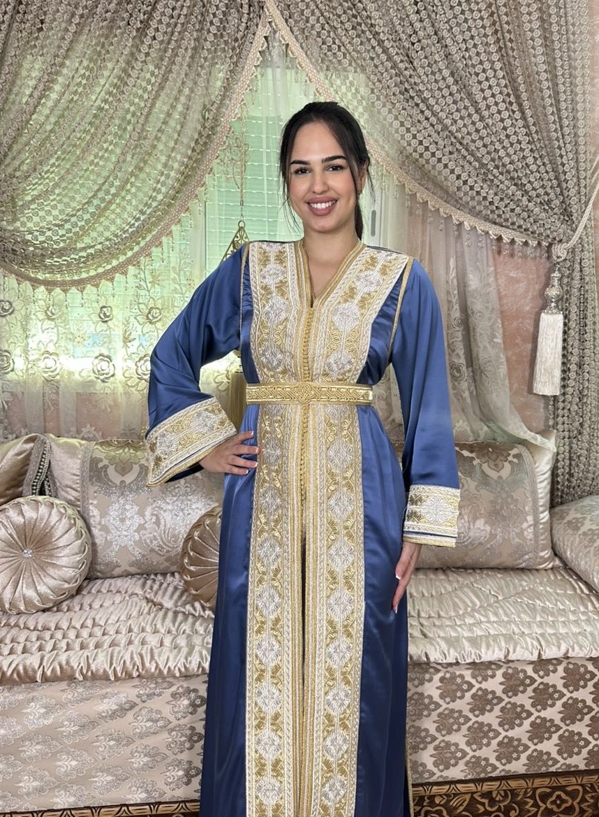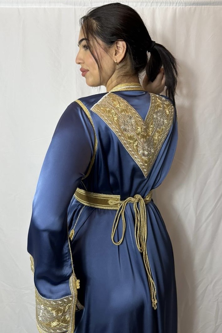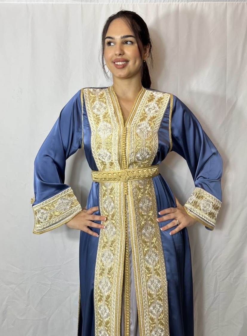 Découvrez notre takchita bleue brodée en fils dorés, un modèle élégant et raffiné idéal pour mariages et soirées orientales. Broderie de haute qualité.