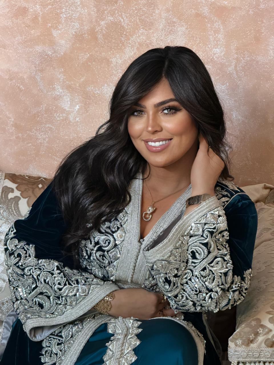Cette takchita incarne l’élégance absolue du savoir-faire marocain. Confectionnée dans un tissu fluide au vert profond et intense, elle est richement ornée de broderies argentées délicatement travaillées, offrant un contraste lumineux et sophistiqué.