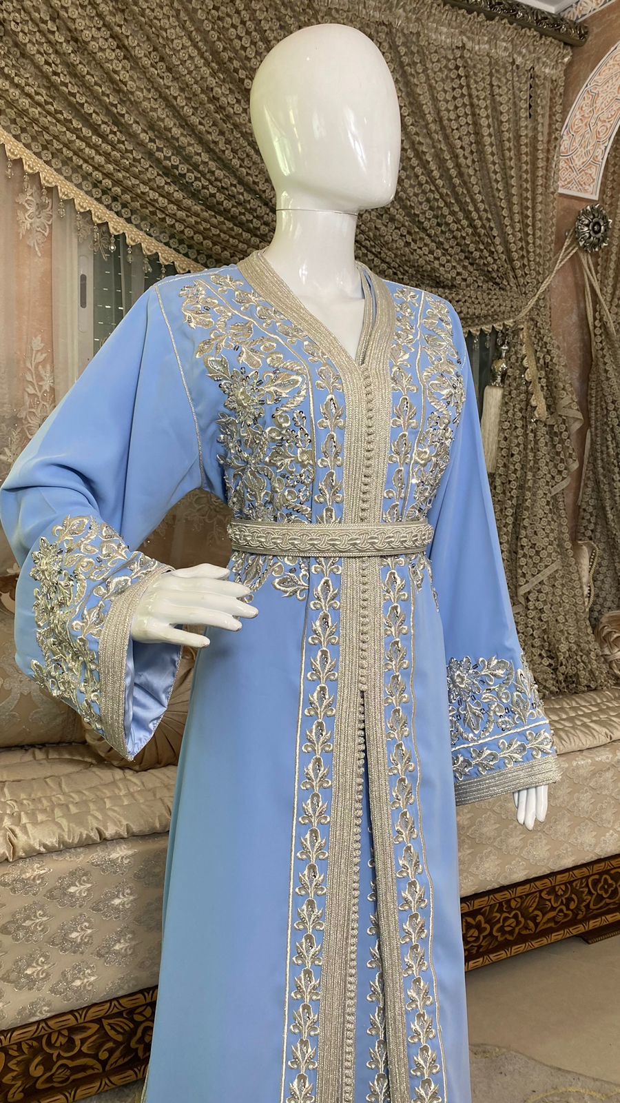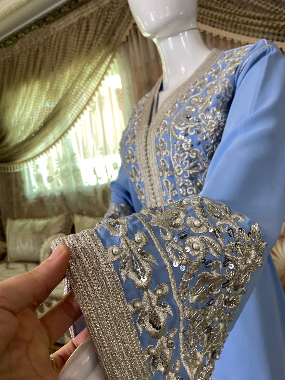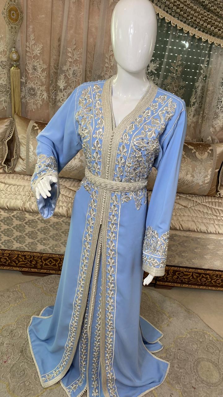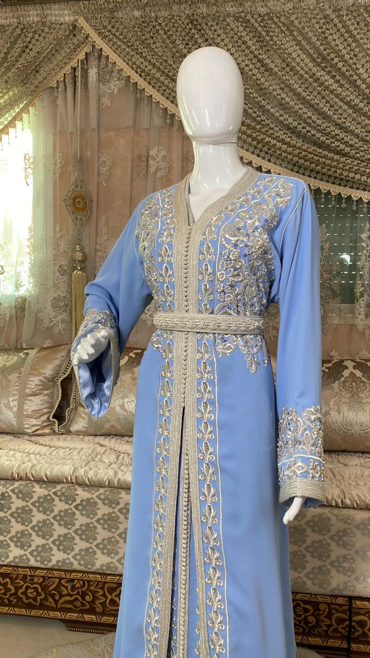Takchita bleu ciel sublimée par de fines broderies argentées. Une tenue élégante et féminine, idéale pour mariages, fêtes et grandes occasions.