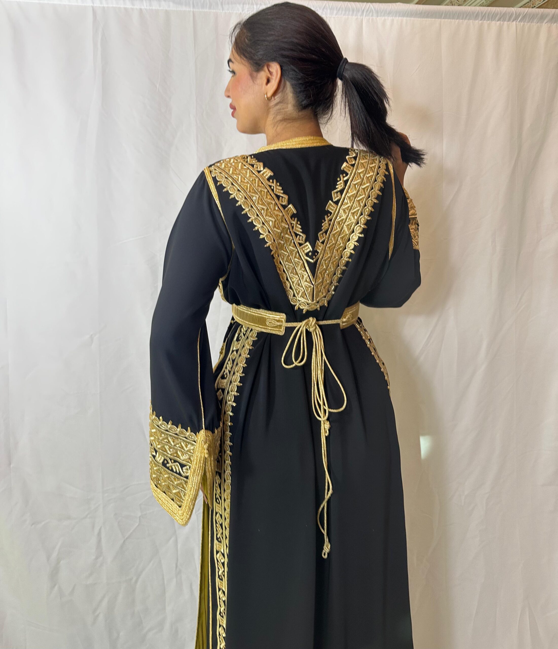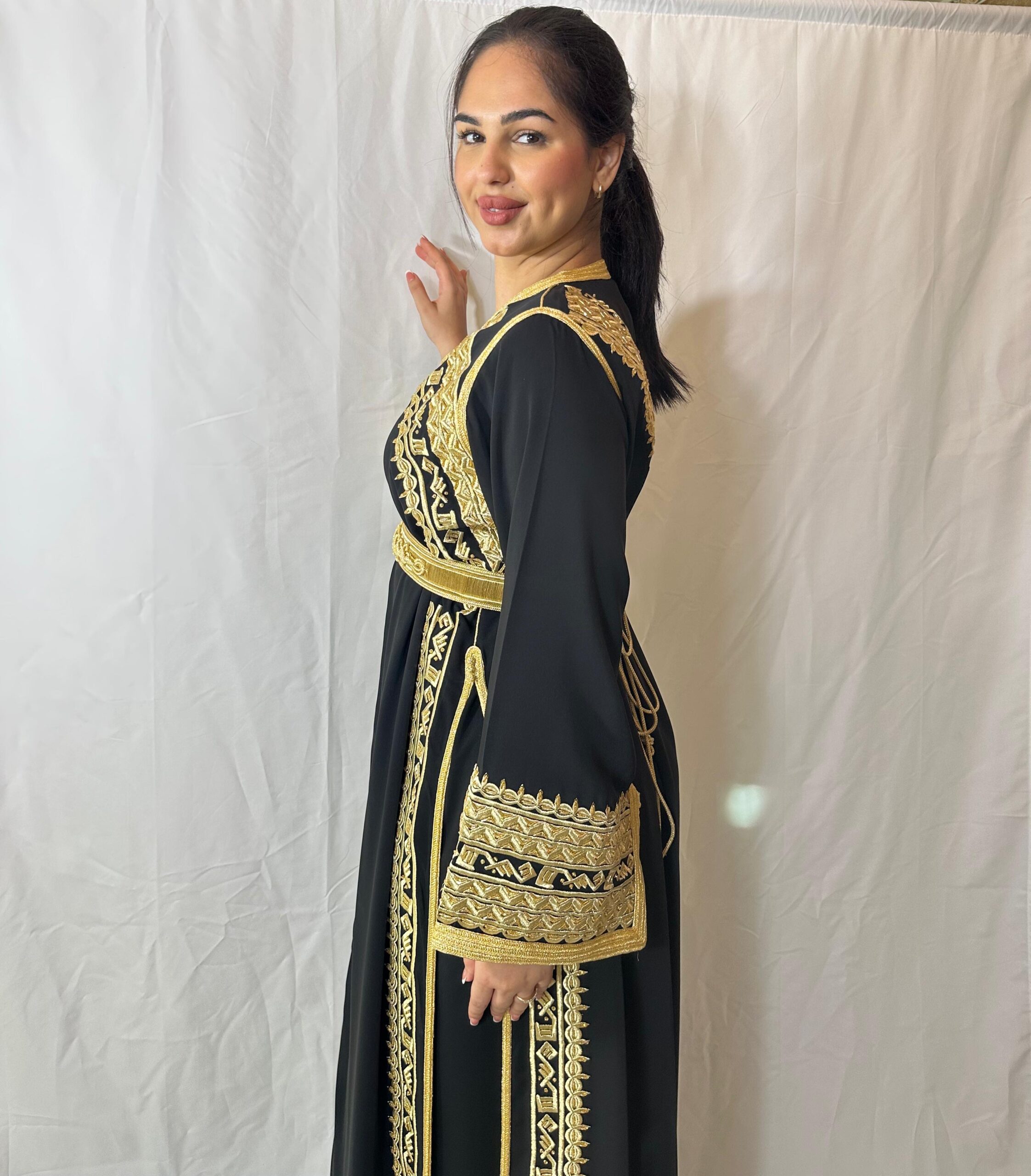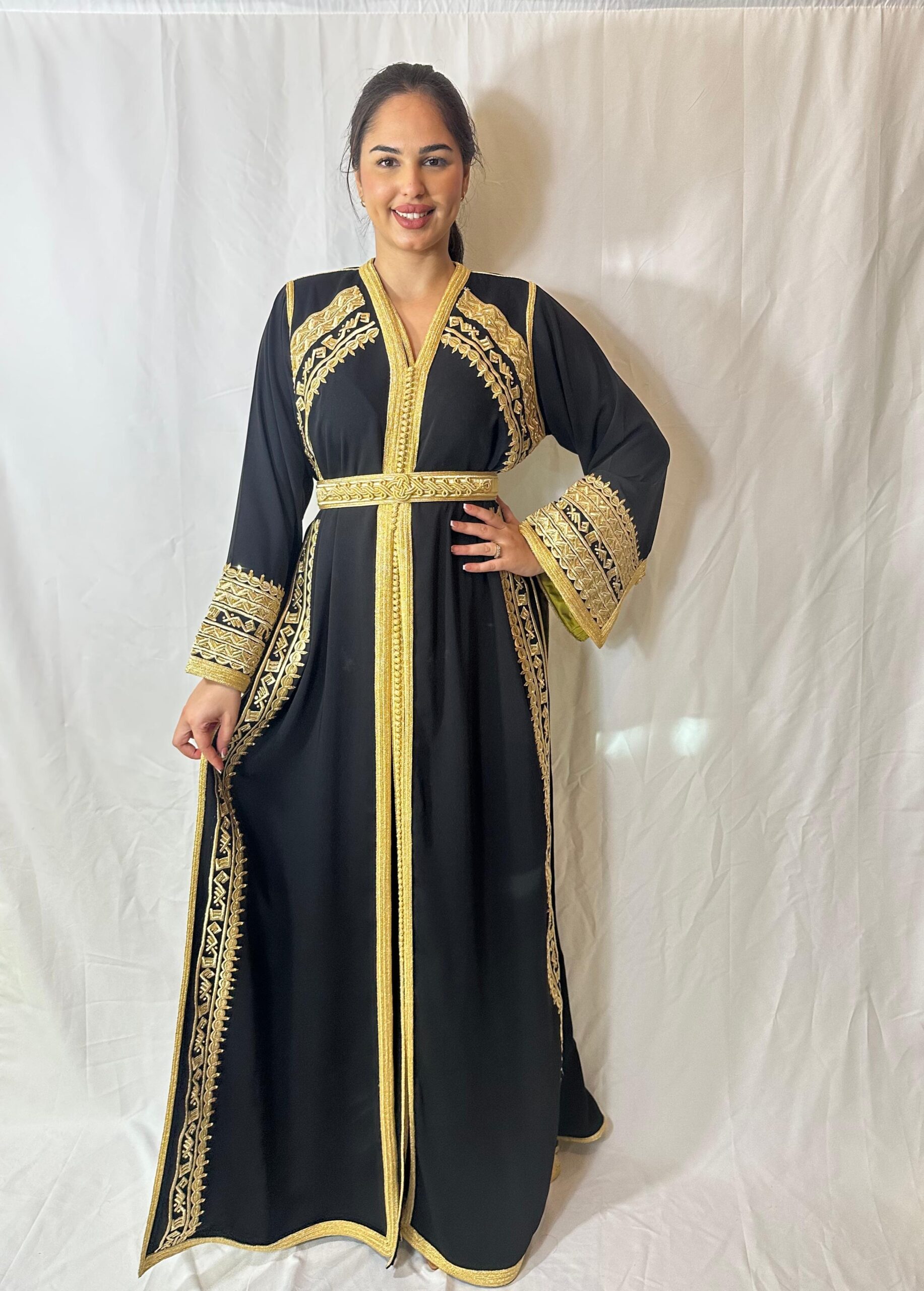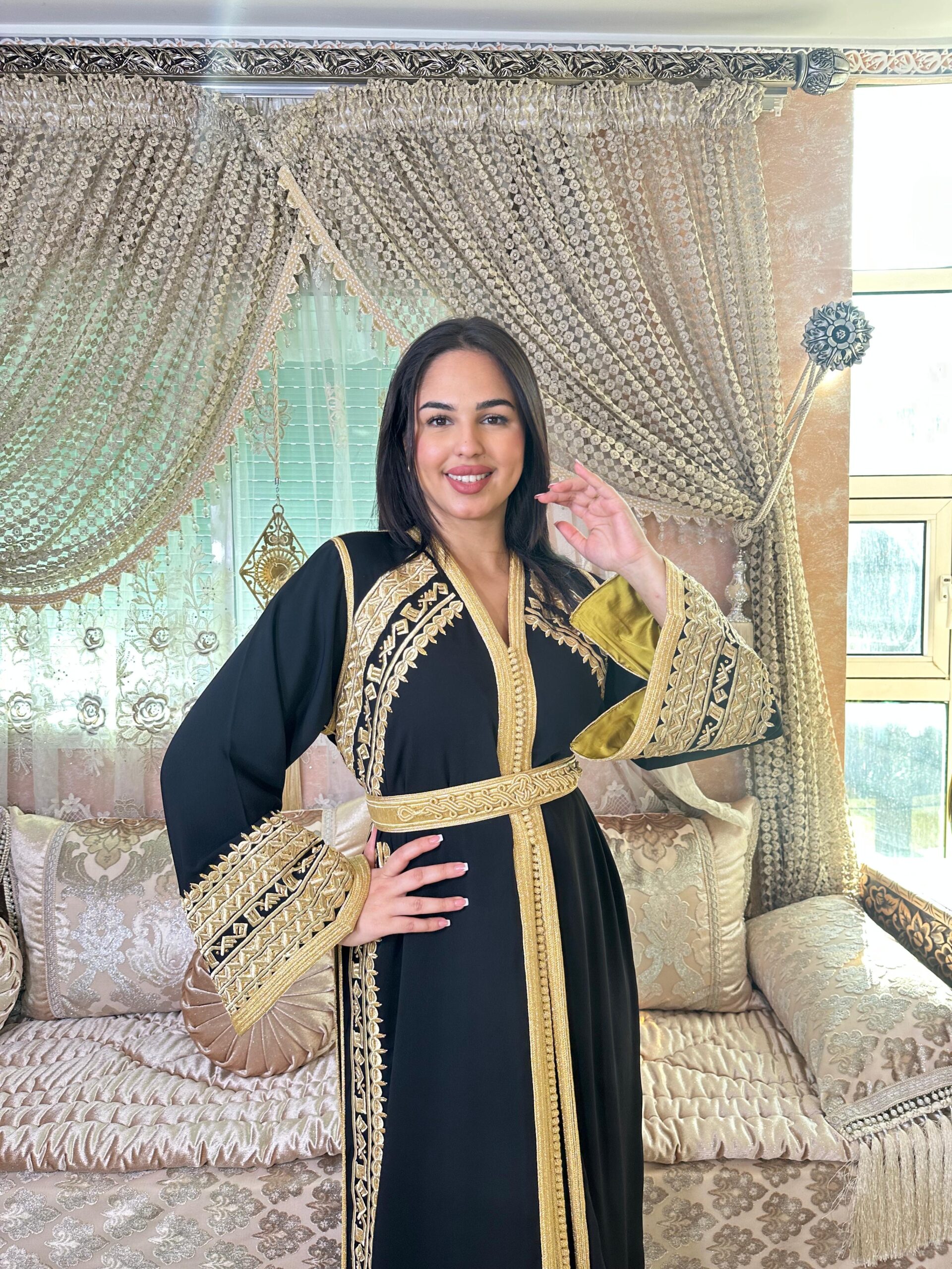 Takchita noire en tissu luxueux, sublimée de broderies dorées . Parfaite pour mariages et grandes occasions.